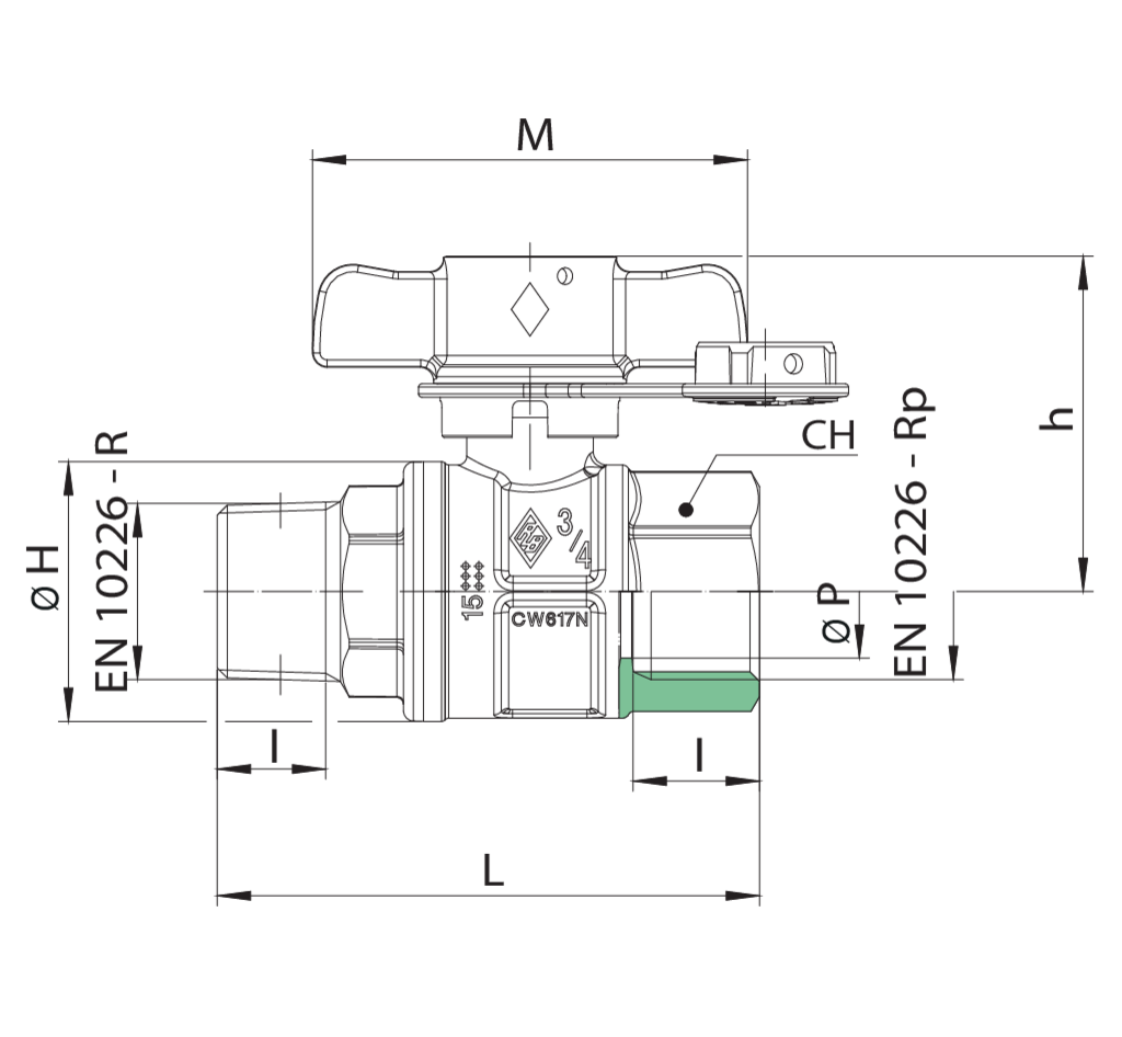 Full bore ball valve for water meter entry, M/F threaded, with anti-tampering T-handle and heptagonal-shaped stainless steel security nut, ball with automatic rinsing system.
