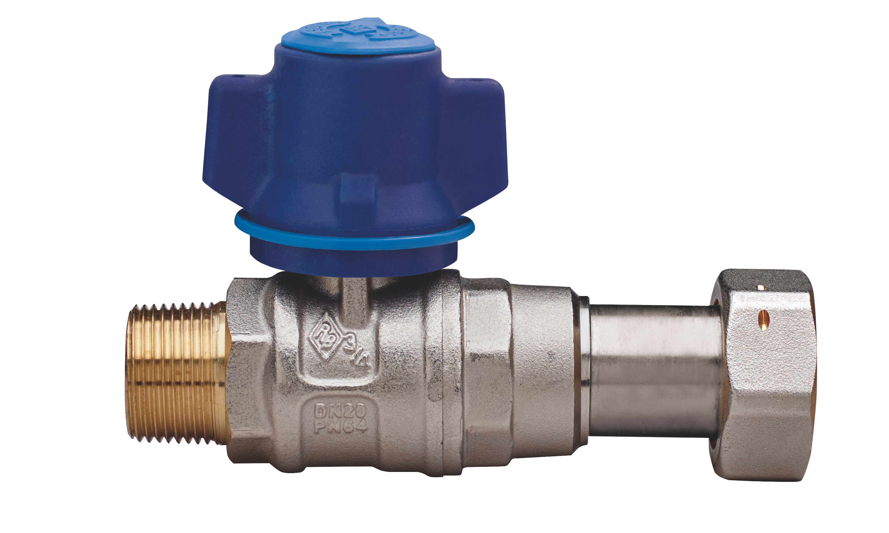 Vanne à boisseau sphérique pour eau, entrée compteur à passage total filetage M/raccord télescopique, avec poignée inviolable et écrou de sécurité en acier inox à profil heptagonal, sphère avec système de rinçage automatique.