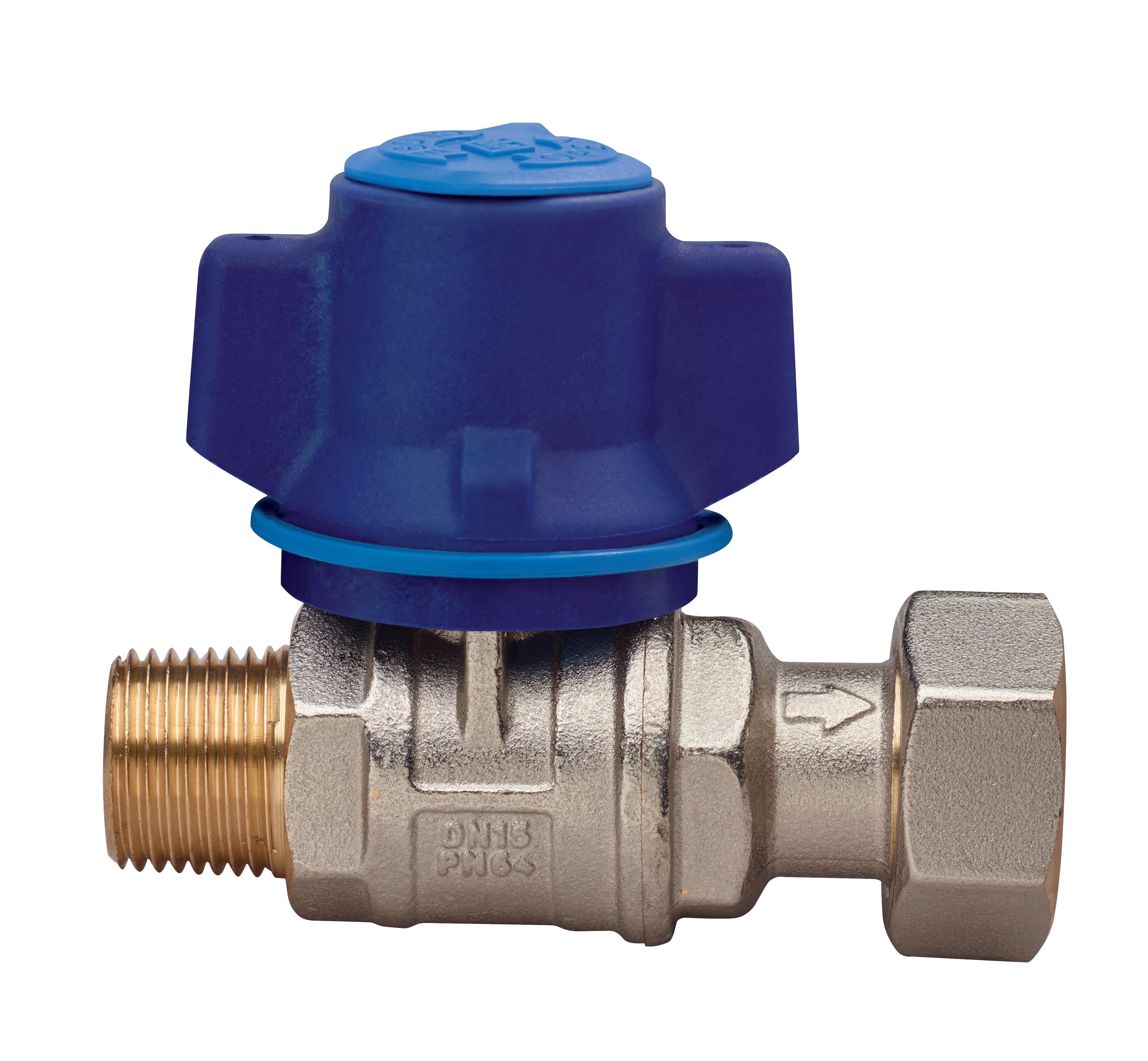 Vanne à boisseau sphérique d’entrée compteur de l’eau, à passage total, taraudée M/écrou, avec poignée anti-violation et écrou de sécurité en acier inox, sphère avec système de rinçage automatique.