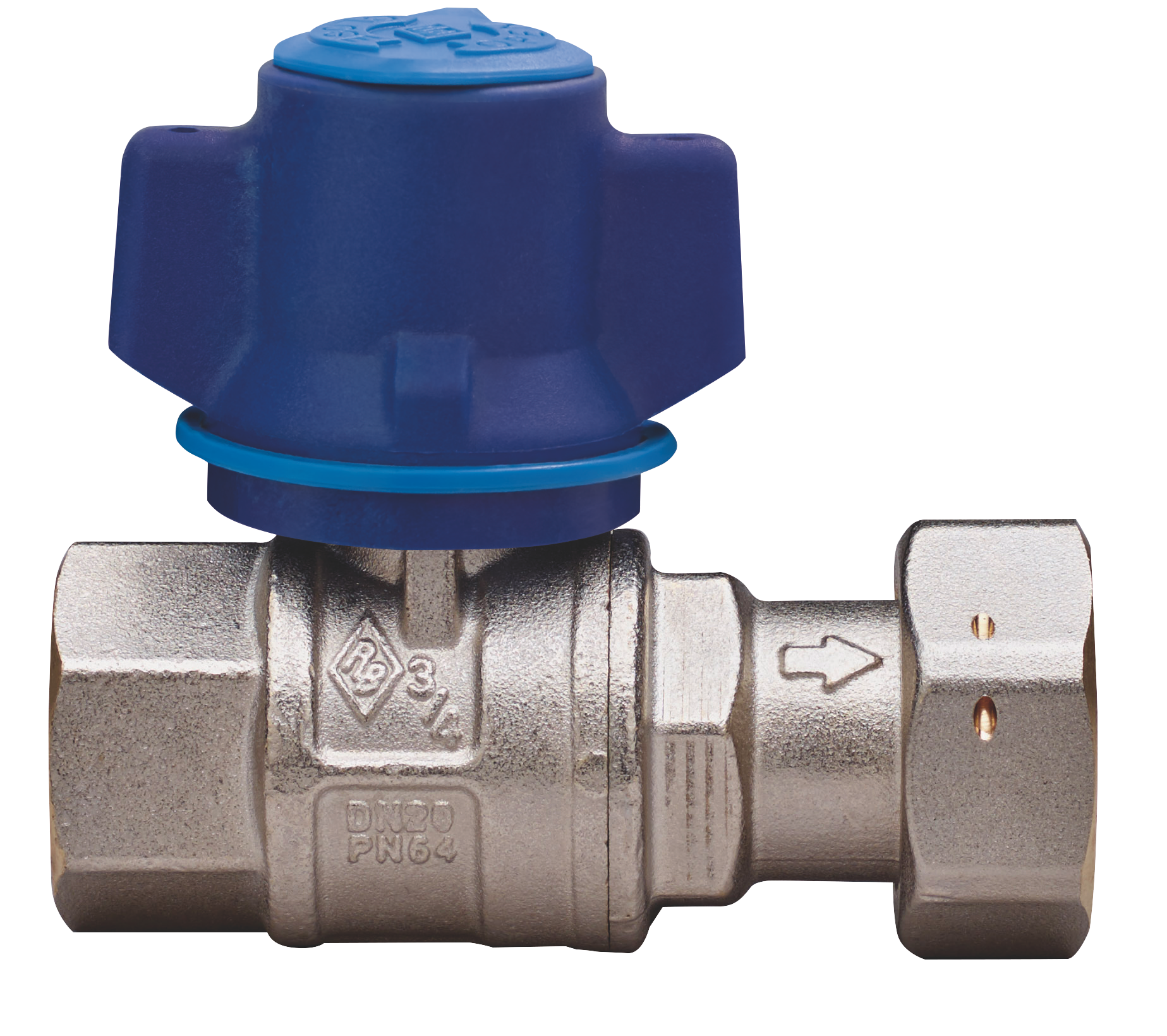 Valvola a sfera per acqua per ingresso contatore, a passaggio totale, filettatura femmina/girello, con farfalla antimanomissione e dado di sicurezza in acciaio inox a profilo eptagonale, sfera con sistema di risciacquo automatico.